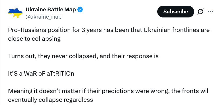 Has the ground war actually been a key strategic focus of Ukraine in 2025? I think the obvious answer is this: absolutely. It has remained a critical part of Ukraine’s national defensive campaign against Russia, and it is the aspect of Ukraine’s war effort which absorbs a larger proportion of mobilised people than any other. It is important for Ukraine to pour resources into the ground war and defend its territory and prevent Ukrainians falling under the abuses of Russian occupation. Importantly, Ukraine’s ground war efforts also seek to minimise Russian gains because Russia has used its capture of Ukrainian territory as an integral part of its global misinformation campaign, with the central message being that its continuous territorial advances were evidence of an inevitable Russian victory. This message has been crucial for Russia’s supporters, as well as its admirers in the White House who wish to impose an unjust peace on Ukraine.