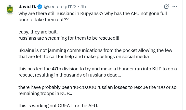 Is that 5 or 6 times now in as many months that RU has captured Kupyansk? It is getting difficult to keep up with their claims