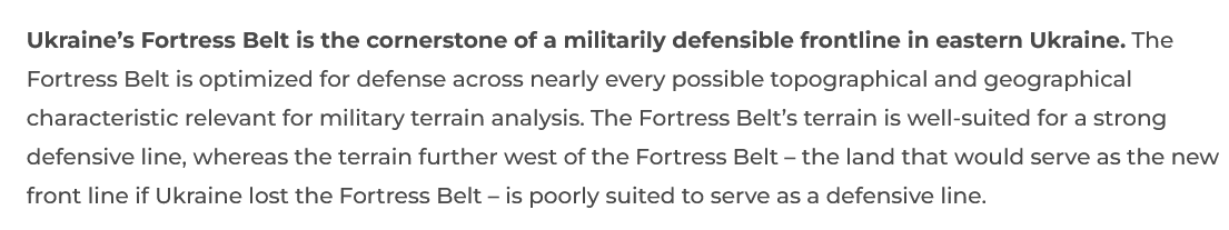 The Fortress Belt is optimized for defense across nearly every topographical and geographical characteristic relevant for military terrain analysis. The human geography and natural terrain present a unique confluence of factors favoring defense, which is why Ukraine has picked this land to build elaborate fortifications for a pitched battle. If Russia were to gain control over the Fortress Belt, Moscow would occupy favorable lines for launching drives into vulnerable terrain that significantly favors attacking forces over defenders. It is for these reasons that the Kremlin’s negotiation strategy seeks to secure a political settlement in which Ukraine would surrender the Fortress Belt’s critical terrain without a fight.