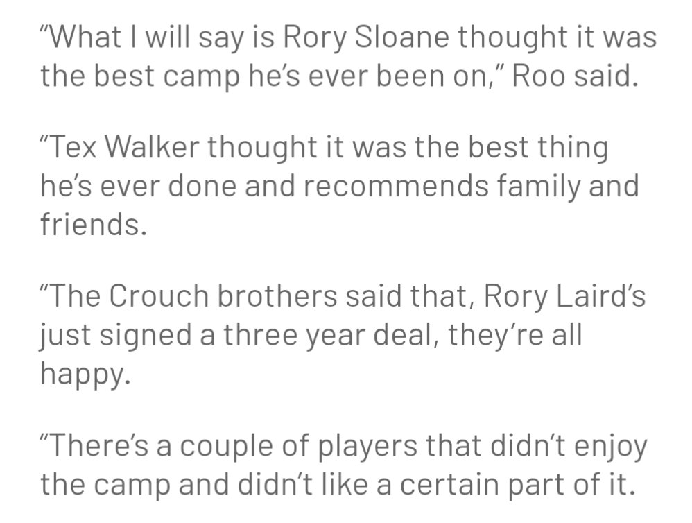 The group that ran the camp has previously said it recognises “that some parts of the camp didn’t resonate with some players”. However, it said it had received overwhelmingly positive feedback from players and the club at the time, and that the group would have been “fired in an instant” if the camp had gone as badly wrong as some had suggested.