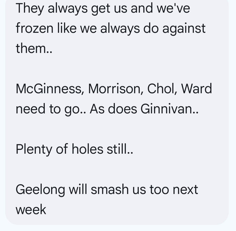 Lol that sounds like the footy relationship my Dad and I share. He’s a Collingwood man and he’s always coming at us from a positive angle - saying player x,y and z look good or that we have turned a corner and can be a contender this year (said this last season) and I always flat bat it lol. No Dad… we’re sh¡t, alright? Don’t do this again lol. At the start, in the 2010’s I didn’t mind them having some success for his sake but I’m so over it now.