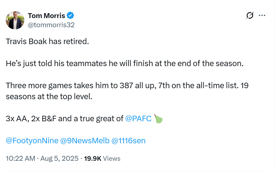 If so it’s a sad day for them and he is a pretty decent bloke. Pity he didn’t get to 400 after what he has done for them as a club and he is a big part of why they stayed alive in the comp