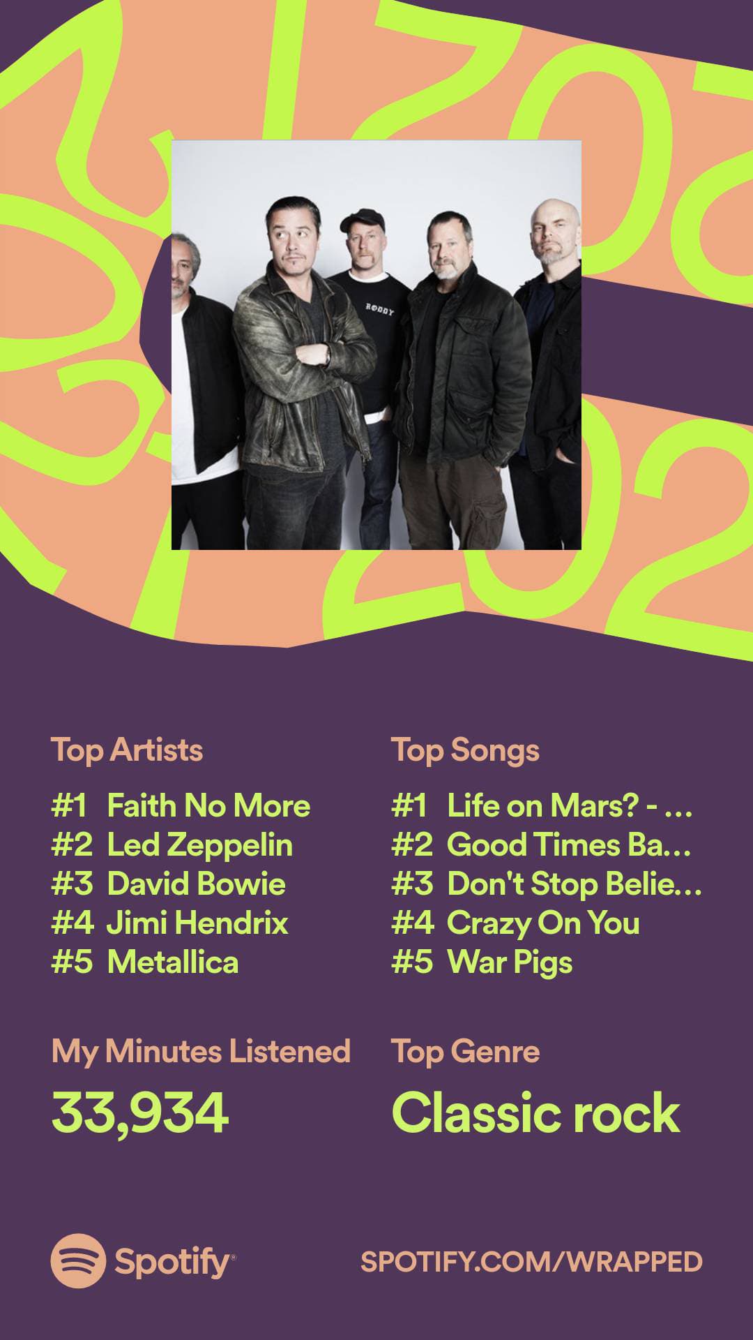 Seems about right. Surprised Life on Mars was my most listened to song, though. My money would have been on War Pigs.