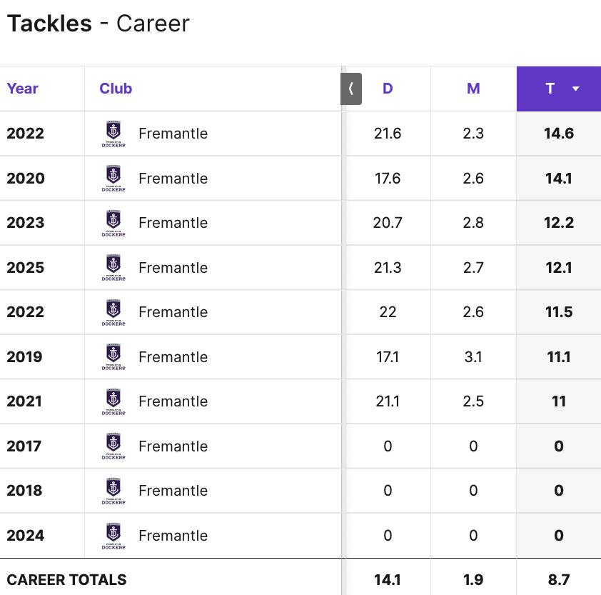 Also, another LOL at the AFL code monkeys for their mathematically-creative career average of Kiara Bower’s tackles: