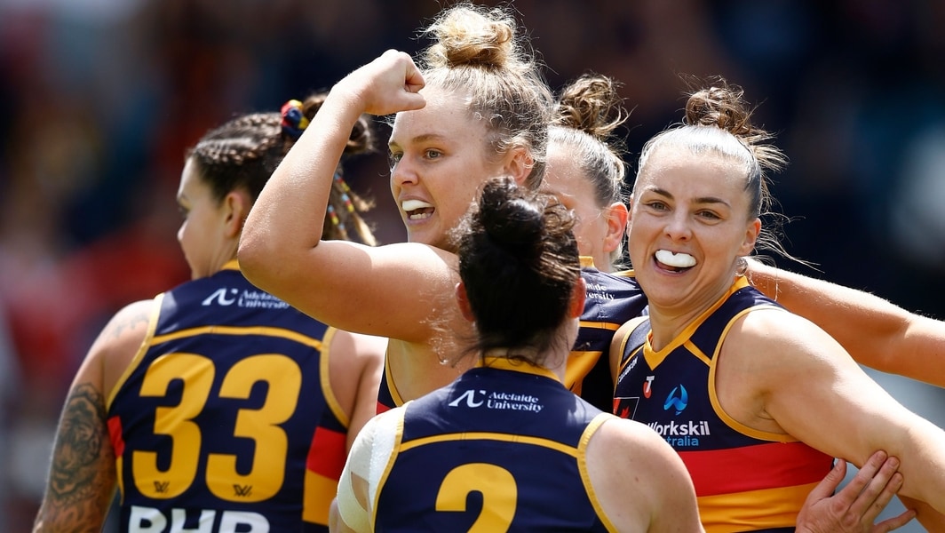 Zoe is Prowse celebrates a goal during Adelaide’s elimination final against St Kilda on November 9, 2025. Picture: AFL Photos