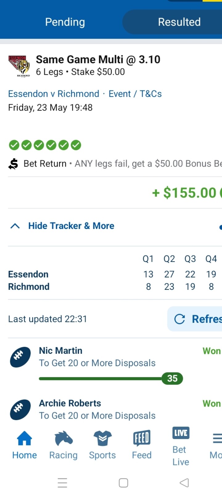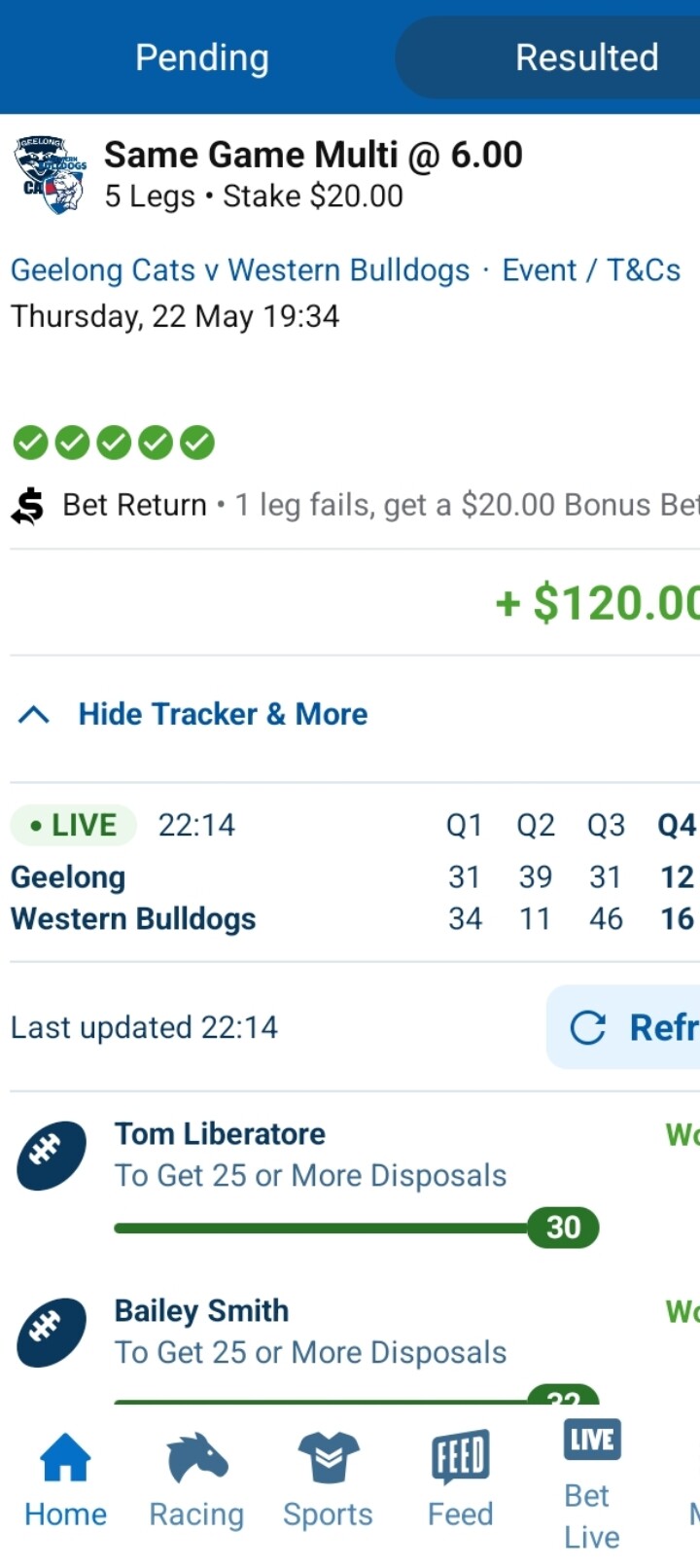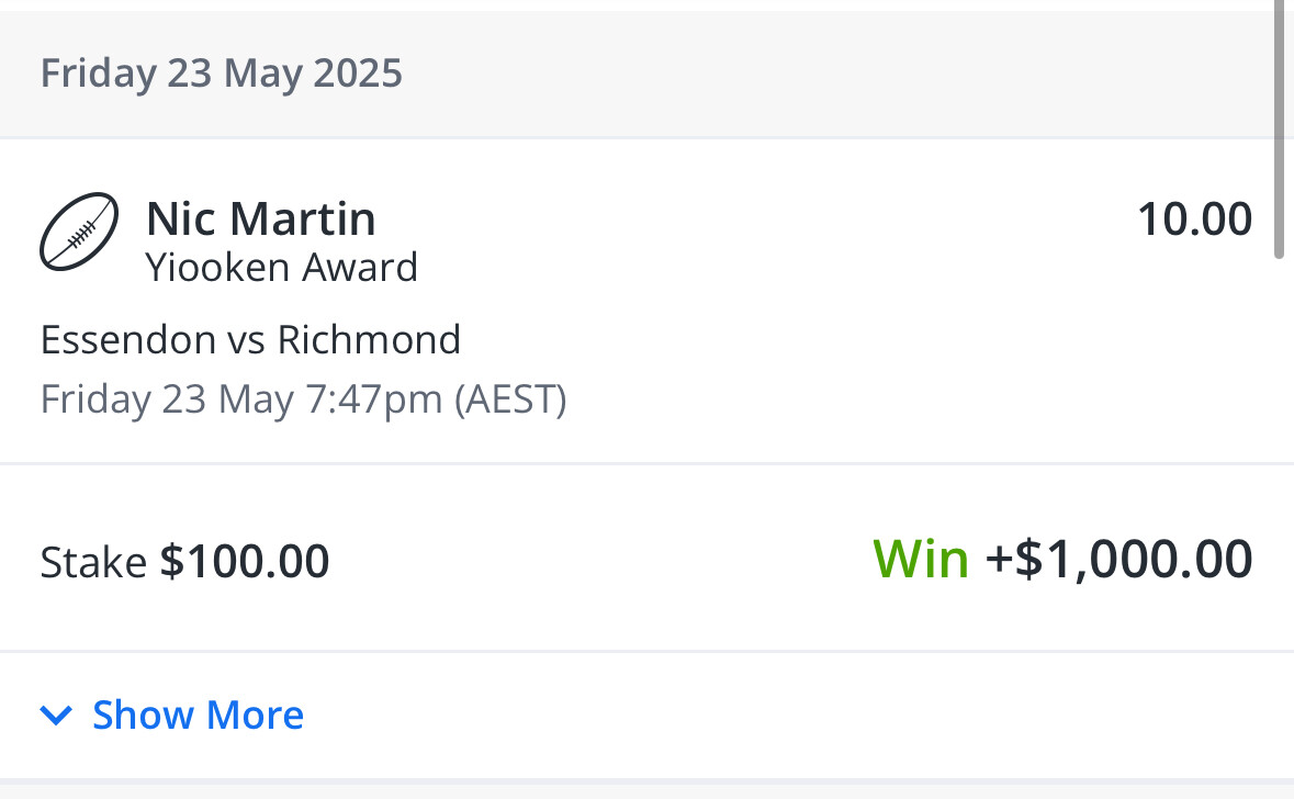 15 leg multibet today. It was my bonus bet from Thursday night. GWS game was a hard watch in the last quarter. Whitfield and Tom Green stuck on 24 possessions each with a minute to go. Whitfield picked up a ground ball and gave it to Green.