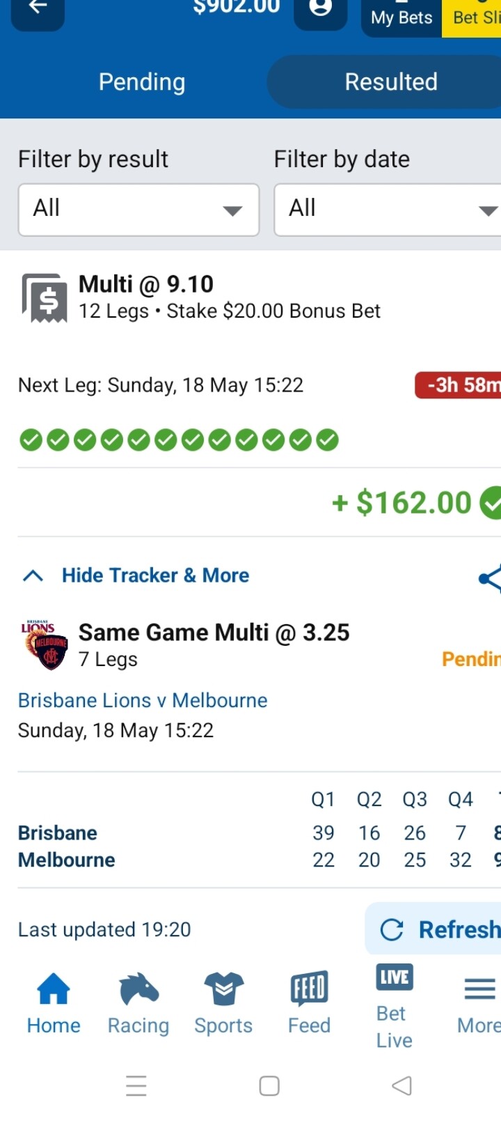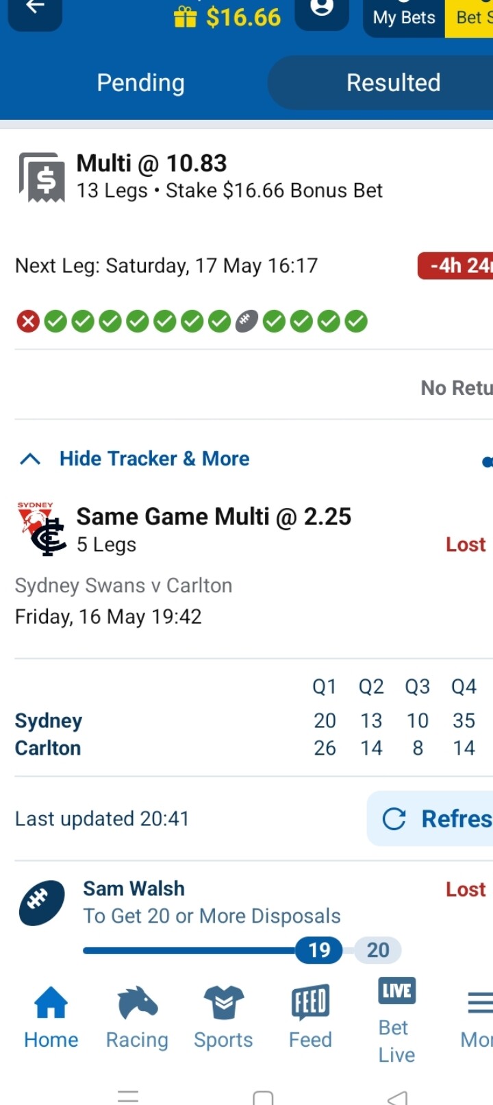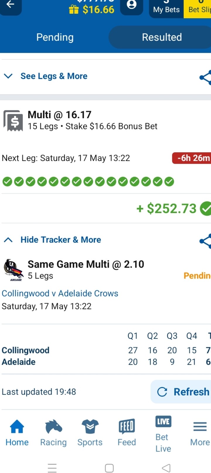 15 leg multibet today. It was my bonus bet from Thursday night. GWS game was a hard watch in the last quarter. Whitfield and Tom Green stuck on 24 possessions each with a minute to go. Whitfield picked up a ground ball and gave it to Green.