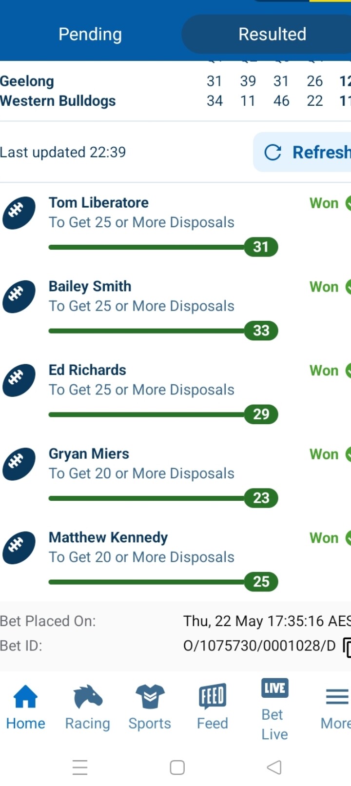 This one was Friday and Saturday early games. Lipinski was void but Sam Walsh for 20 and he got the 19 hahaha. I will say one thing, the amount of times I have missed out on a multi by one possession and think geez I was robbed and then going through the ones I have won and seeing all the ones you have for 20 possessions and 2 or 3 get exactly 20 it is a fine line either way. It does make watching the non Essendon games a bit more interesting
