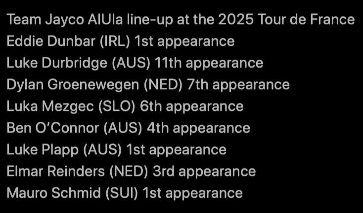 This is the best possible team Jayco could select. Groenewegen, Plapp and Schmid can win a stage and O’Connor can do a good GC. Plapp is an interesting case in that he denied he was going to the TDF, and I suspect there was some arm twisting by the team. Anyway the TDF could be the making of Plapp.