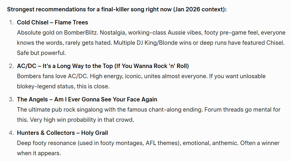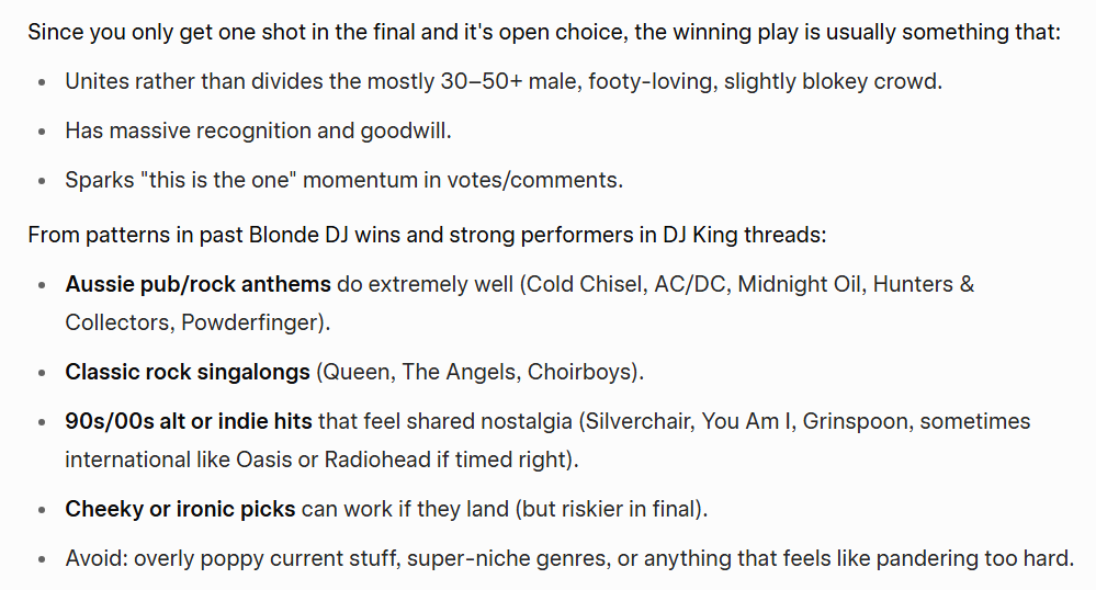 **Avoid Overplayed Classics:** Songs that have been played hundreds of times in previous threads (e.g., Jefferson Airplane - White Rabbit) are unlikely to win.