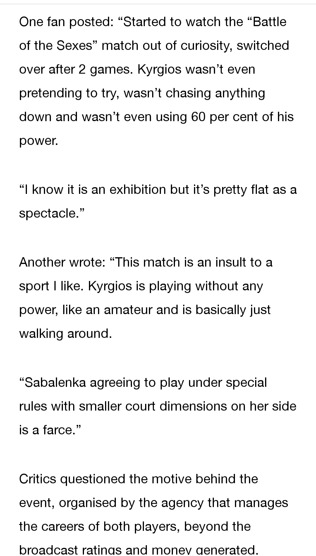 I think Sabalenka did a disservice to the womenās game. Its not like 50 years ago when Billie Jean King played when the women were struggling for tournaments, prizemoney, fan and corporate interest, so it could be considered a necessity. The womenās game is in rude health, so there was nothing to be gained.