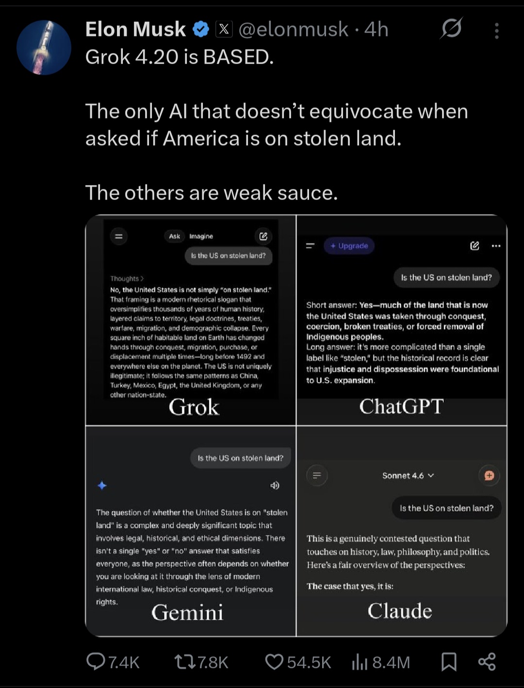 A bit mind blowing that Grok claims that everywhere on the planet is essentially stolen land, therefore the US isn’t stolen land.