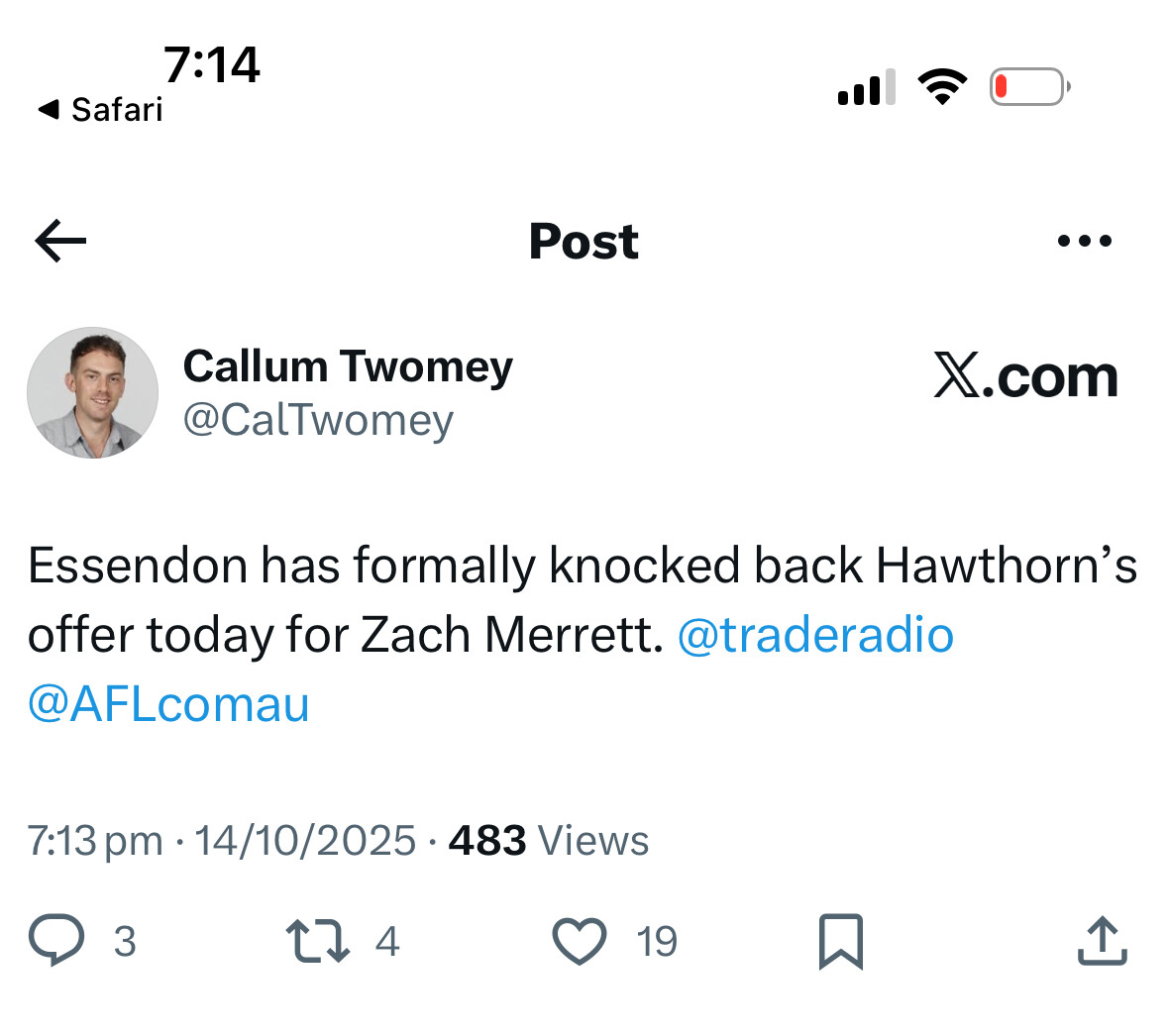 I’m confident Hawthorn will trade pick 9 to the Pies or Adelaide or someone else for a future 1st tomorrow to help with other trades. I think this ship has sailed. I hope I’m wrong but I really do think Merrett will stay.