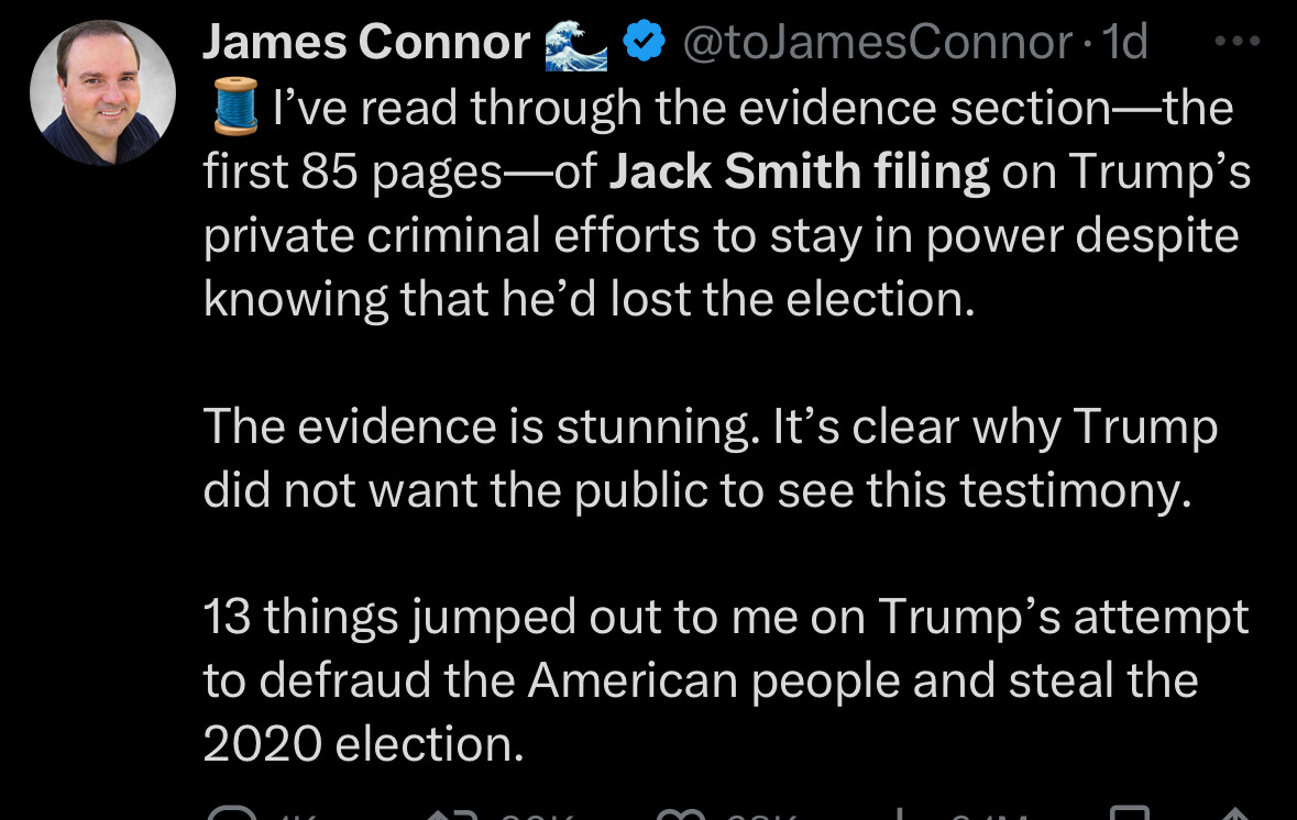 Iāve read through the evidence sectionāthe first 85 pagesāof Jack Smith filing on Trumpās private criminal efforts to stay in power despite knowing that heād lost the election.