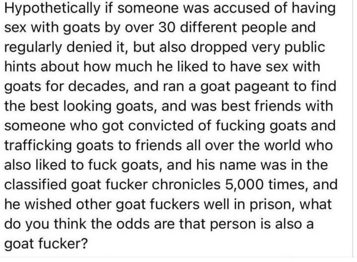 Given quite aptly this thread which is much about trump has morphed into a discussion of goat farking, if you read “Selkirk’s Island” by Diana Souhami, it tells the story of the real person on whom the story of Robinson Crusoe was based.