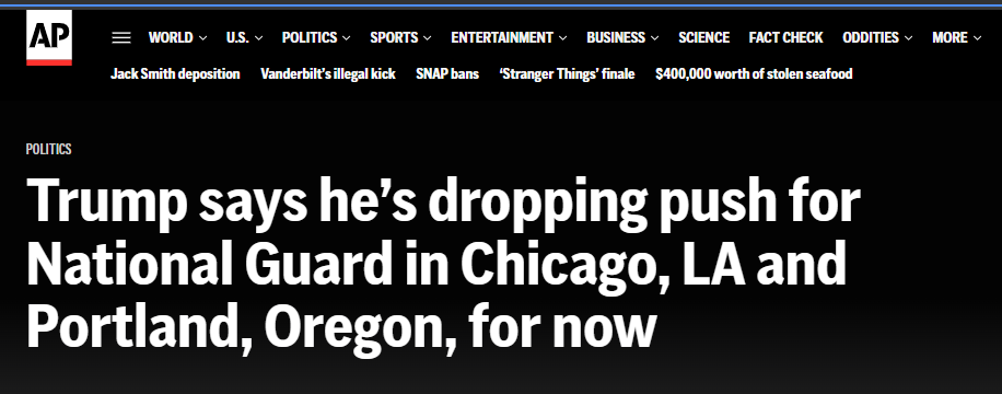 WASHINGTON (AP) — President Donald Trump said he’s dropping — for now — his push to deploy National Guard troops in Chicago, Los Angeles and Portland, Oregon, a move that comes after legal roadblocks held up the effort.