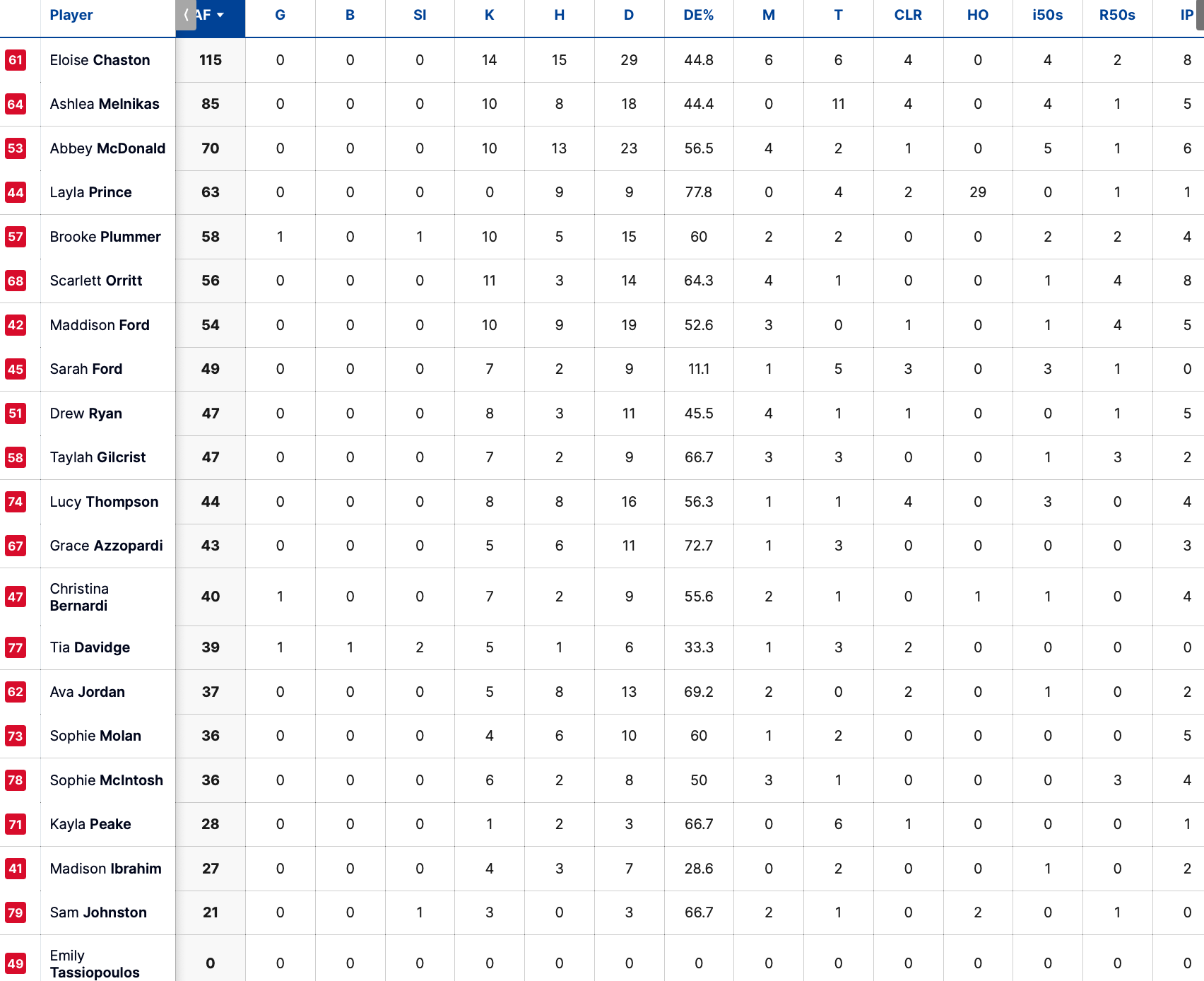 - Ash and El were our tops for contested possessions (14 and 13). El also lead uncontested possessions across both teams (17) with McDonald (14) behind their Arianna Clarke.