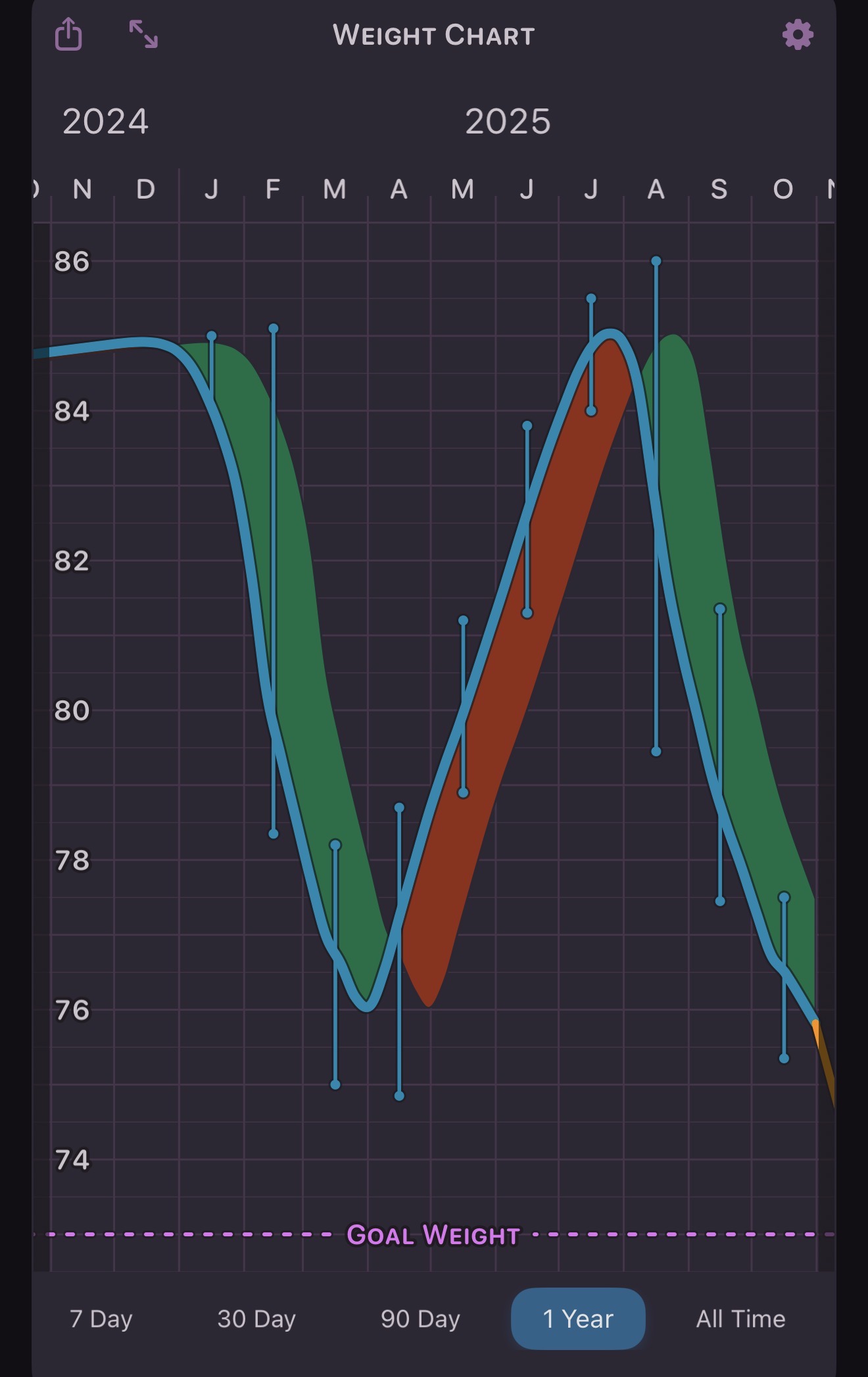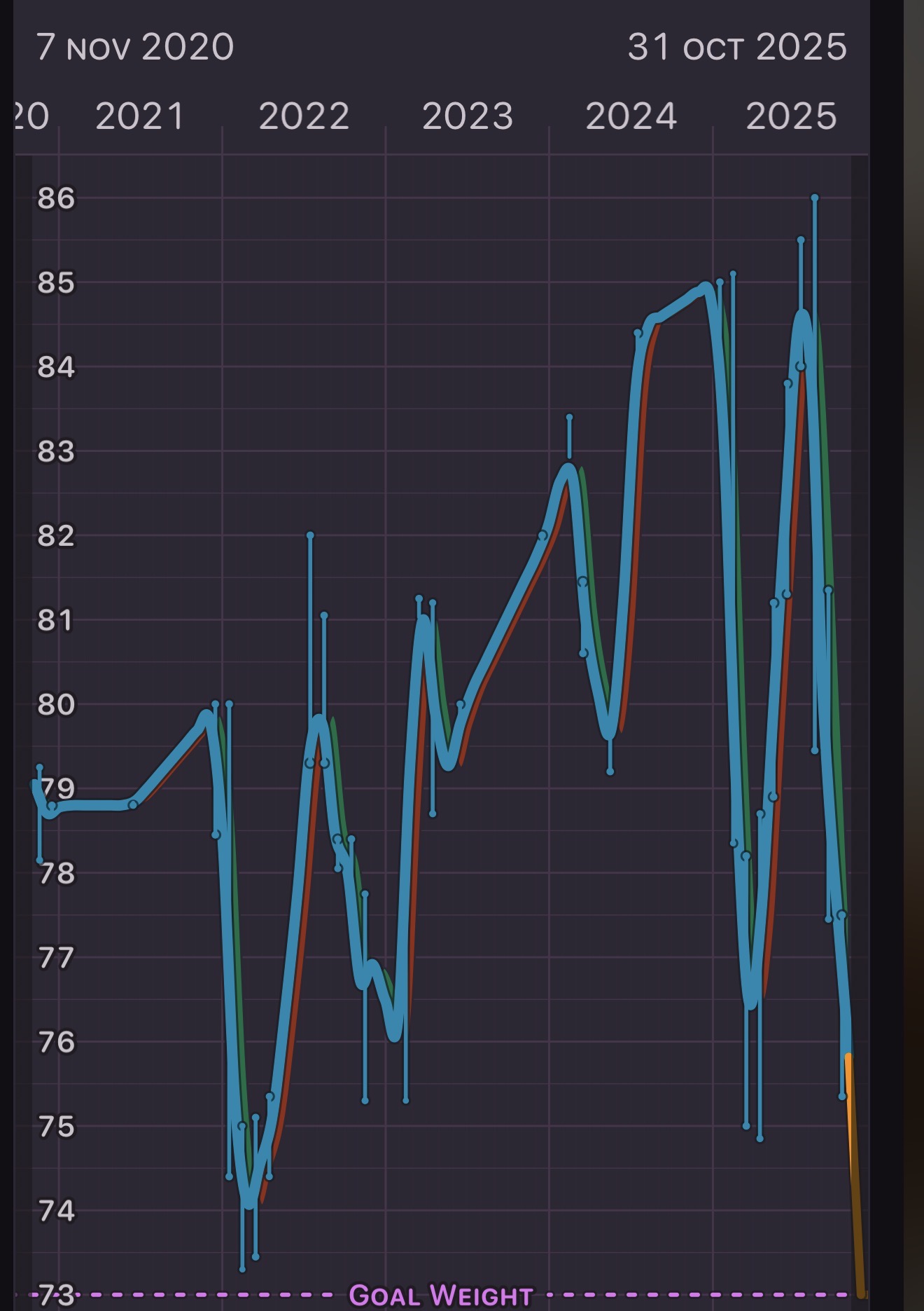 I find this App called Happy Scale that produces the charts is a great guide as it uses a smoothing scale rather than point to point day to day. I also use MyNetDiary which I’ve found to be the best calorie tracker.